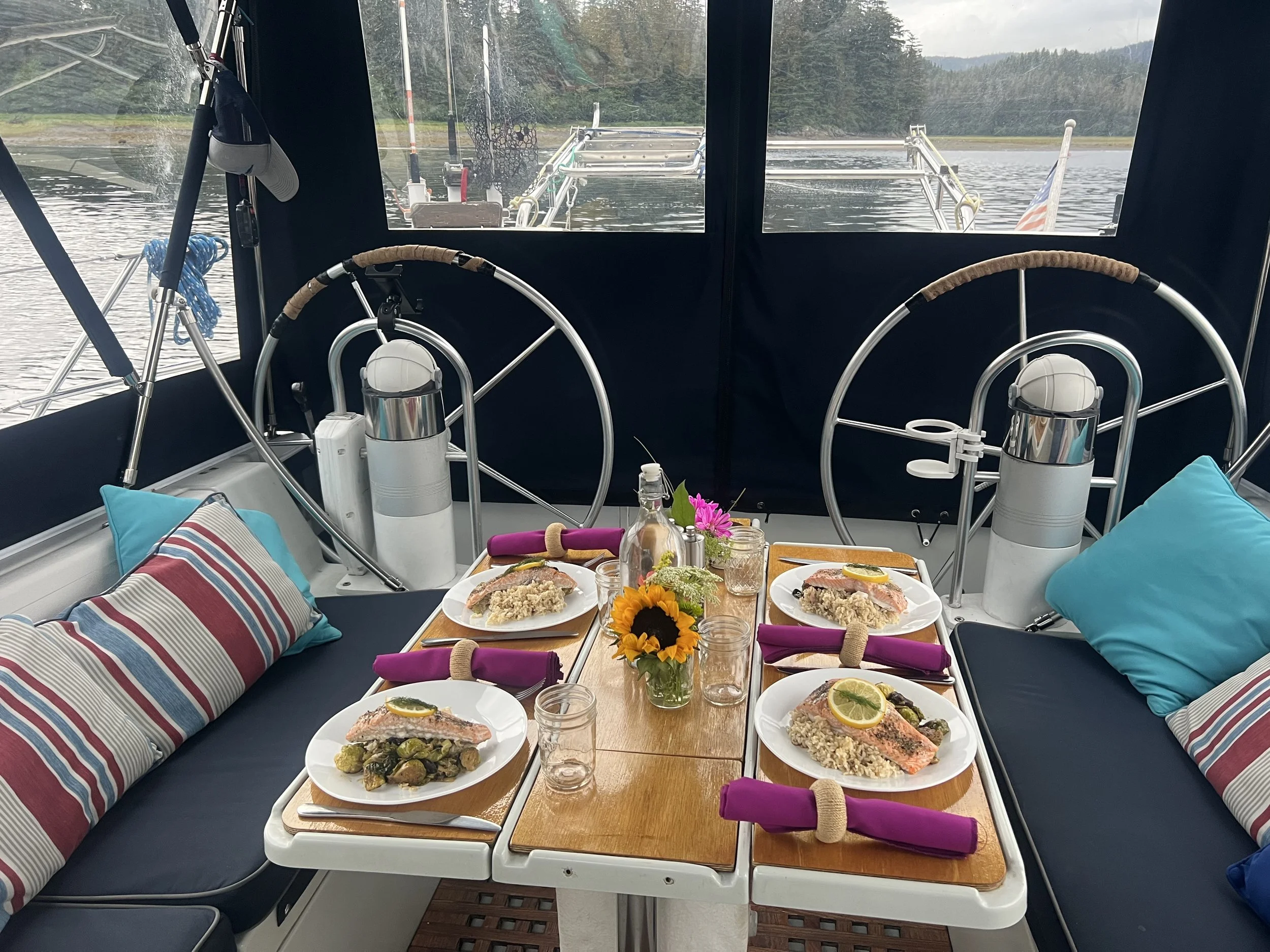 Your E-Bike Tour will end at the Small Boar Harbor, where you’ll meet Capt. Brendan and Chef Ben, and board our 50’sailing sloop Hopscotch! After working up an appetite on the bikes you’ll be ready for lunch! As we cast off from the dock, Chef Ben will serve you a hearty and healthy lunch as we get underway and head into the Taiya inlet!